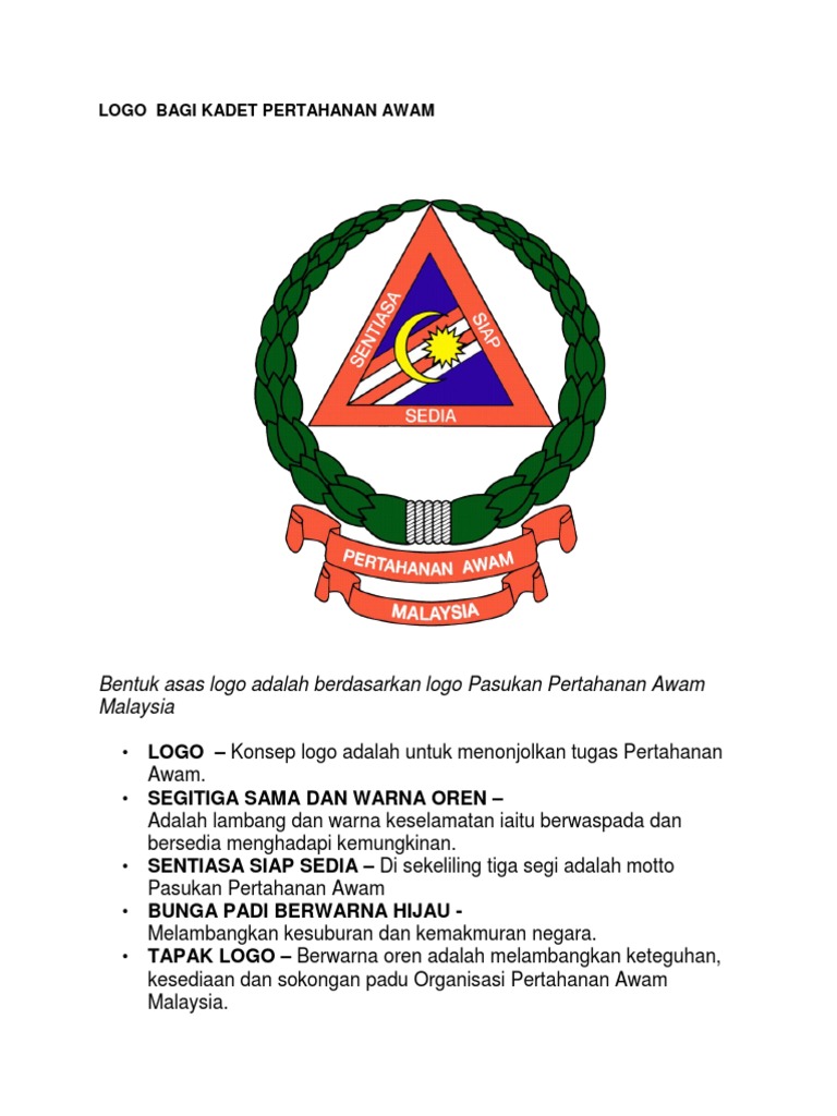 Maksud logo angkatan pertahanan awam. Melatih seramai mungkin rakyat yang mempunyai pengetahuan dalam aspek keselamatan dan pertahanan awam seksyen 3 2 c akta pertahanan awam 1951 akta 221. Apabila negara mencapai kemerdekaan dalam tahun 1957 tanggungjawab pertahanan awam terletak di bawah bidangkuasa kerajaan persekutuan. Penolong pengarah kesenian.