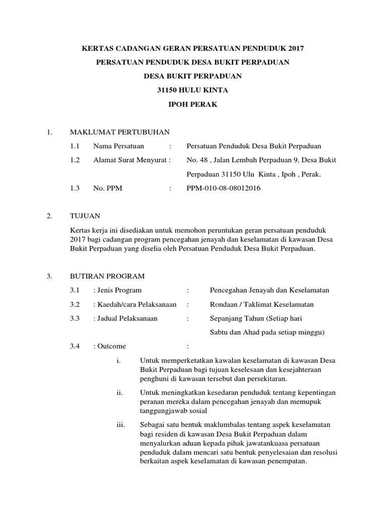 Kertas Cadangan Geran Persatuan Penduduk 2017 Persatuan Penduduk Desa Bukit Perpaduan Desa Bukit Perpaduan 31150 Hulu Kinta Ipoh Perak