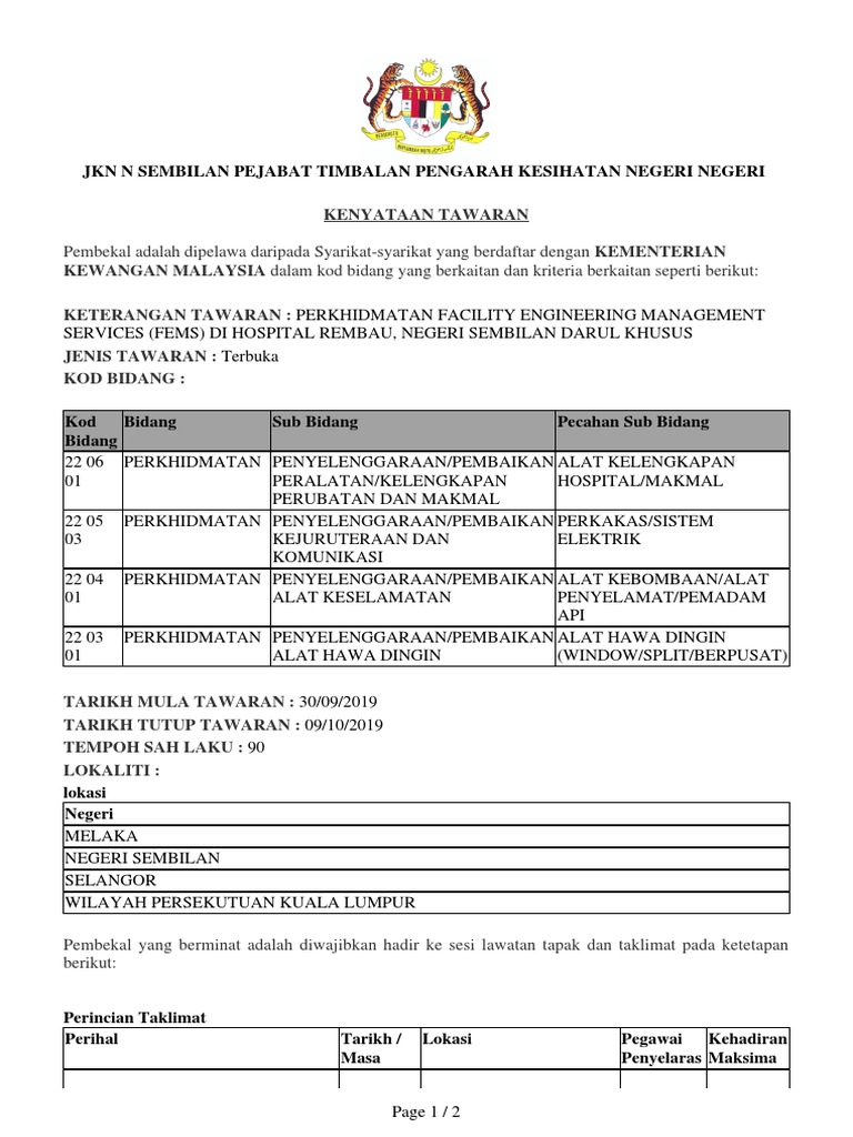 Sebutharga jabatan kesihatan negeri sembilan. Jabatan kesihatan negeri negeri sembilan dan kementerian kesihatan malaysia dengan nyata menafikan semua liabiliti untuk mana mana orang atau entiti untuk sebarang kehilangan atau kerosakan akibat daripada atau berkaitan dengan penggunaan atau pergantungan keseluruhan atau mana mana bahagian apa apa maklumat yang diperolehi dari laman web rasmi ini. Paparan terbaik mozilla firefox versi 43 0 ke atas dan resolusi 1024 x 768 piksel minimum. Jabatan kesihatan negeri selangor tidak bertanggungjawab terhadap apa apa kehilangan atau kerugian yang disebabkan oleh penggunaan mana mana maklumat kecacatan atau kesilapan kandungan yang terdapat di dalam portal ini portal di dalam bahasa cina dan india telah dijana secara automatik menggunakan aplikasi google translator.