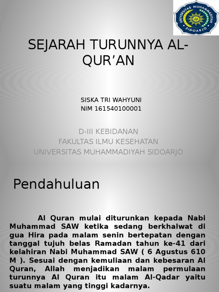 Sebelum mengetahui lebih jauh tentang al quran kita harus memahami terlebih dahulu sejarah turun dan penulisan al quran dari zaman nabi muhammad s a w sampai dengan masa kita sekarang ini. Proses turunnya al quran berlangsung selama 22 tahun 2 bulan dan 22 hari secara berangsur angsur. Wahyu pertama yang turun adalah surat al alaq ketika nabi muhammad berusia 40 tahun pada tanggal 17.