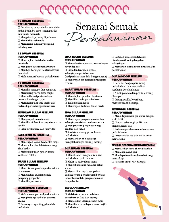 Senarai semak majlis perkahwinan. Garis masa senarai semak perkahwinan akan membantu anda menguruskan banyak perkara yang terlibat dalam perancangan majlis perkahwinan. 12 bulan sebelum majlis perkahwinan memilih tarikh untuk majlis pernikahan dan persandingan memilih lokasi majlis waktu jamuan dan tempahan makanan menentukan gaya serta tema majlis persandingan mengaturkan bajet memilih perancang majlis perkahwinan yang terbaik dan mengikut kemampuan anda. Sediakan folder khas untuk simpan dokumen resit supplier borang berkaitan kahwin.