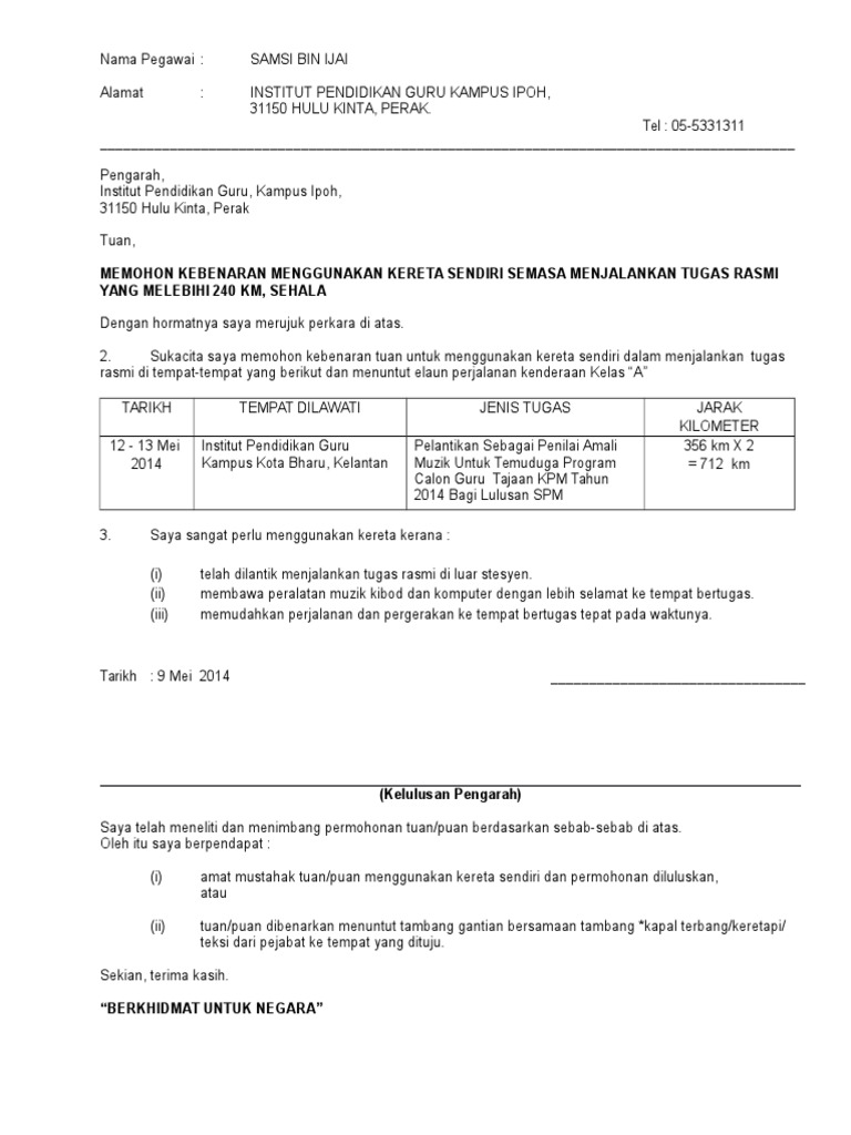 Contoh Surat Kebenaran Penggunaan Kenderaan