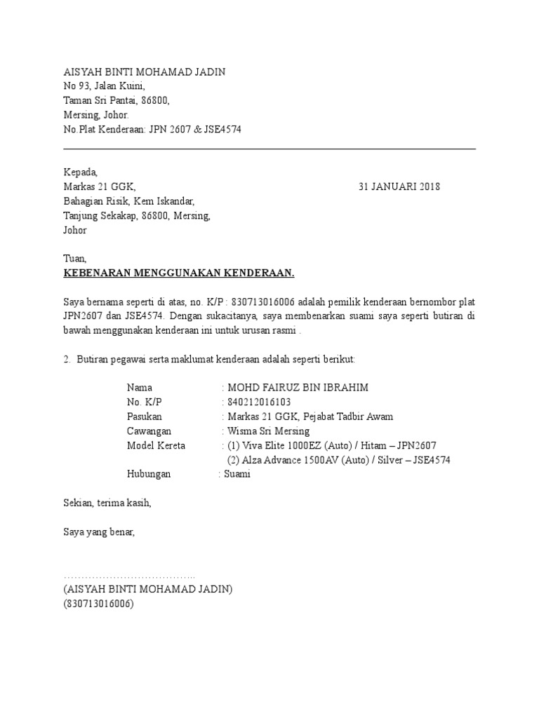 Contoh Surat Kebenaran Menggunakan Kenderaan Suami