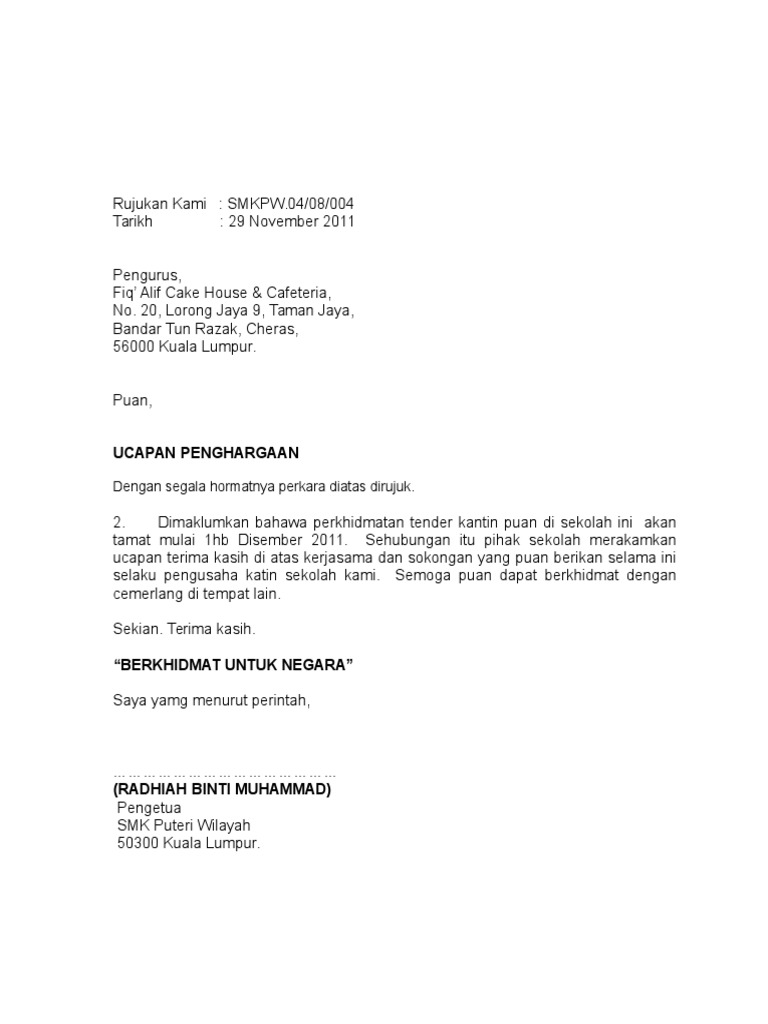 Surat Terima Kasih Tamat Tender Kantin
