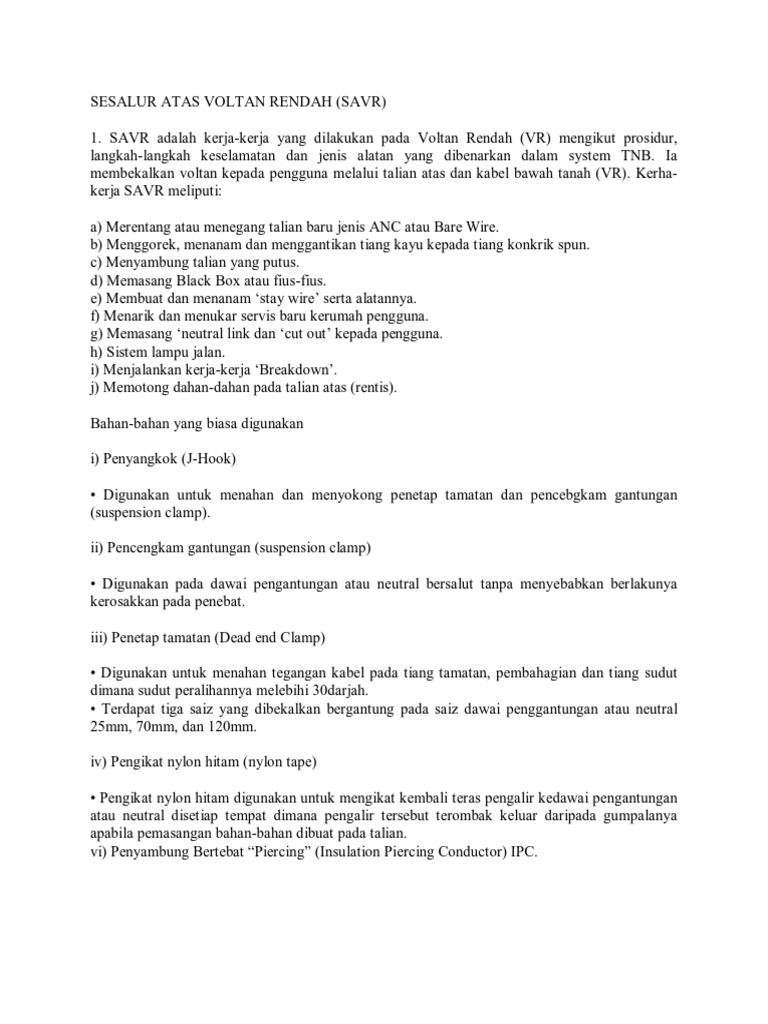 Talian atas voltan rendah. Amali talian atas voltan rendah amali papan suis utama voltan rendah amali penyegerakan vr synchronizing ujitatah geganti relay valibration kursus separuh masa pendawai elektrik pw2 pw4 penjaga jentera elektrik a0 a4 kursus modular modul talian atas voltan rendah untuk keterangan lanjut sila hubungi. Savr adalah kerja kerja yang dilakukan pada voltan rendah vr mengikut prosidur langkah langkah keselamatan dan jenis alatan yang dibenarkan dalam system tnb. Memiliki buku log yang lengkap berkaitan kerja kerja dan pengalaman di atas yang telah disahkan oleh orang kompeten berkaitan dan juga majikan.