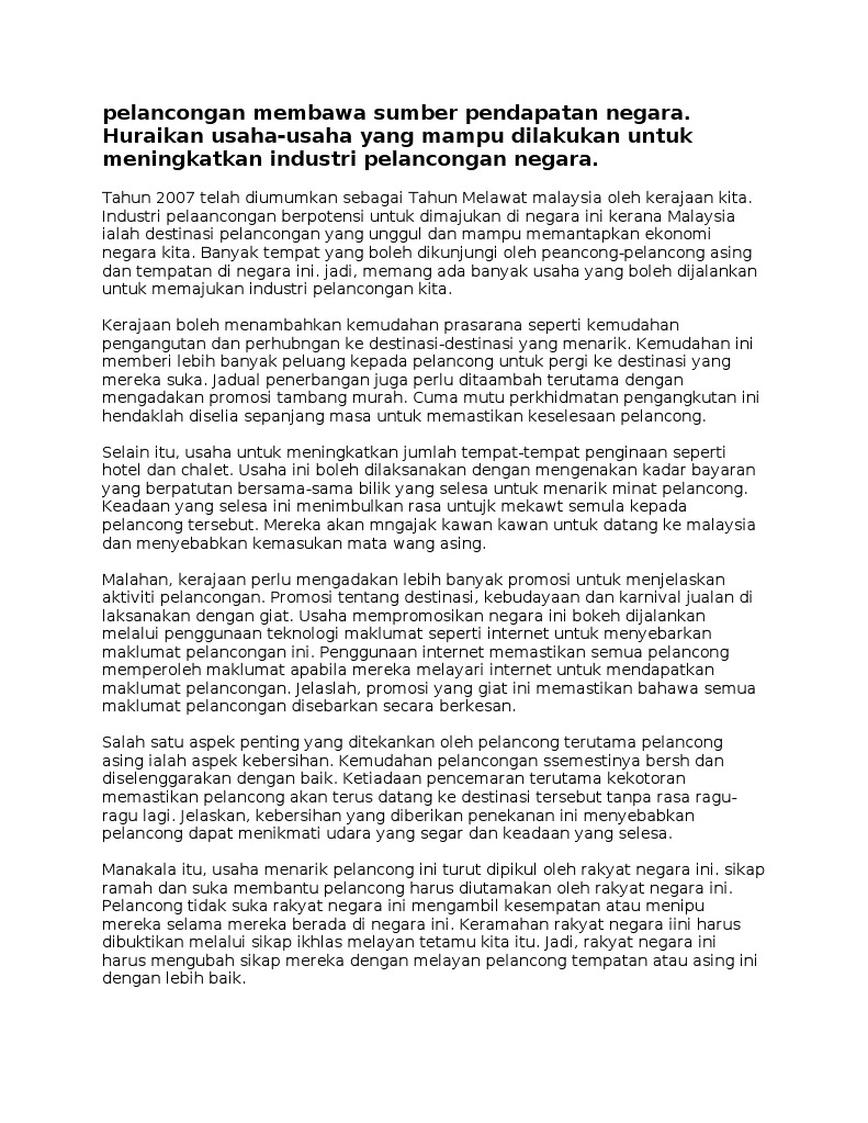 Usaha usaha memajukan industri pelancongan karangan pt3. Kemukakan usaha usaha yang perlu dilakukan untuk menggalakkan kedatangan. Fareena 30 september 2018 3 24. Dalam tahun ini utk pt3 karangan ini keluar.