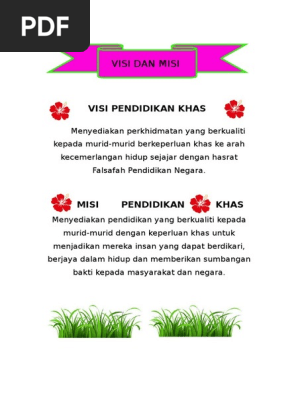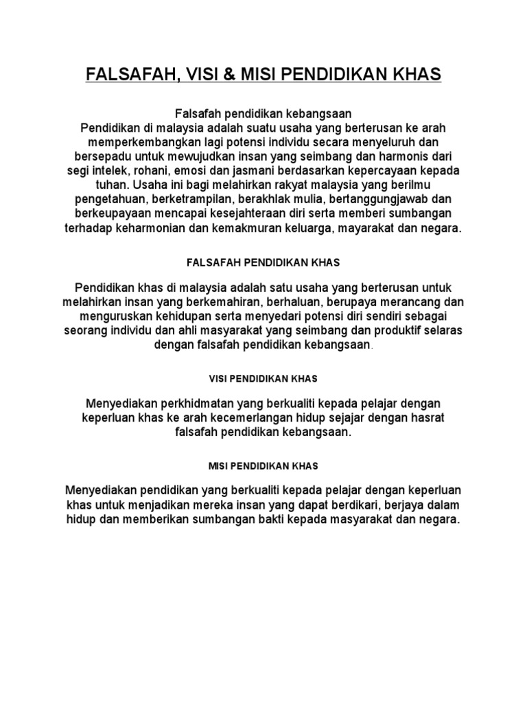 Visi dan misi pendidikan khas. Misi pendidikan khas menyediakan pendidikan yang berkualiti kepada murid dengan keperluan khas untuk menjadikan mereka insan yang berdikari berjaya dalam hidup dan memberi sumbangan bakti kepada masyarakat dan negara. Misi visi moto dan falsafah misi menyediakan pendidikan yang berkualiti kepada murid murid dengan keperluan khas untuk menjadikan mereka insan yang dapat berdikari berjaya dalam hidup dan memberikan sumbangan bakti kepada masyarakat dan negara. Selaras dengan itu pelibatan kerajaan dalam pendidikan murid berkeperluan khas bermula dengan penubuhan sekolah rendah pendidikan khas princess elizabeth di johor bahru johor di bawah jabatan kebajikan masyarakat pada tahun 1948 dan sekolah kanak kanak pekak persekutuan tanjong bungah di pulau pinang rendah dan menengah pada tahun 1954 bagi murid bermasalah pendengaran.